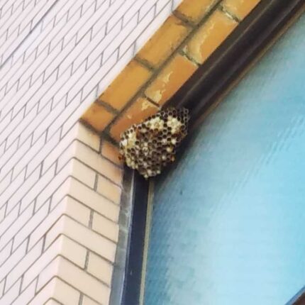 窓とカベに貼りついたスズメバチの巣…横浜市西区