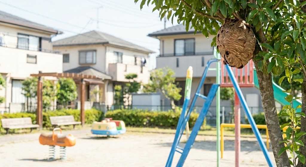 公園の遊具、街路樹、市道の法面(のりめん)、公立学校の敷地内などで蜂の巣を見つけた場合は、市が管理者責任として対応します。