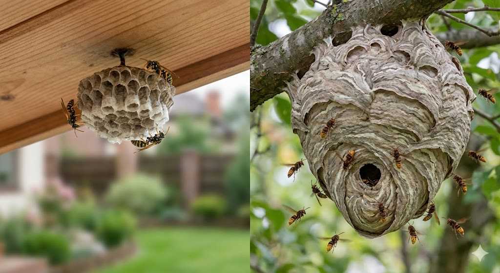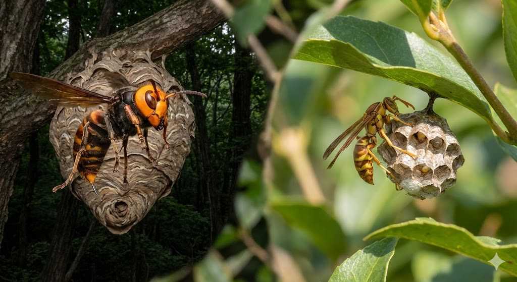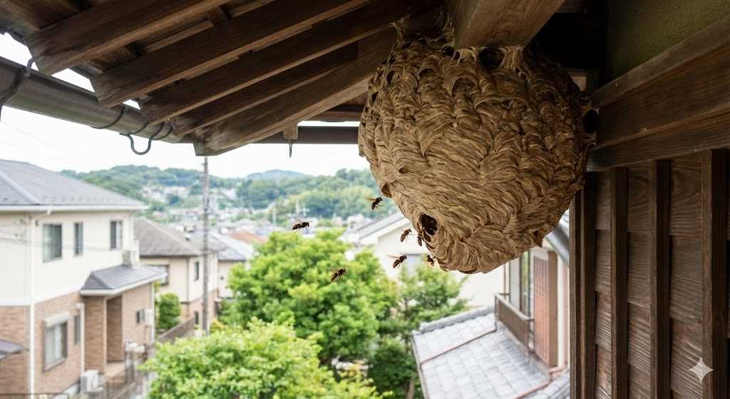- 性格: 非常に攻撃的。巣に近づくだけで偵察蜂が威嚇してきます。南区の住宅街では、軒下や屋根裏に「キイロスズメバチ」が、庭木の中に「コガタスズメバチ」がよく巣を作ります。