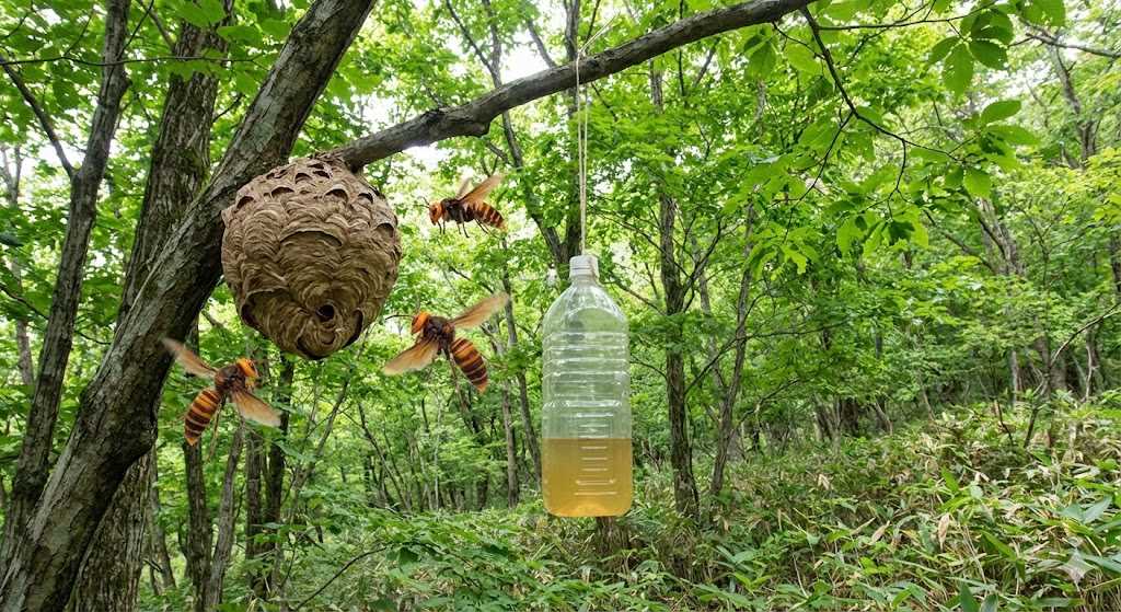 さらに積極的な対策として「ハチ取りトラップ」の設置があります。これは、酒、酢、砂糖などを混ぜた甘酸っぱい誘引液を容器に入れ、女王蜂をおびき寄せて捕獲するものです。市販品も優秀ですが、ペットボトルを使って自作することも可能です。